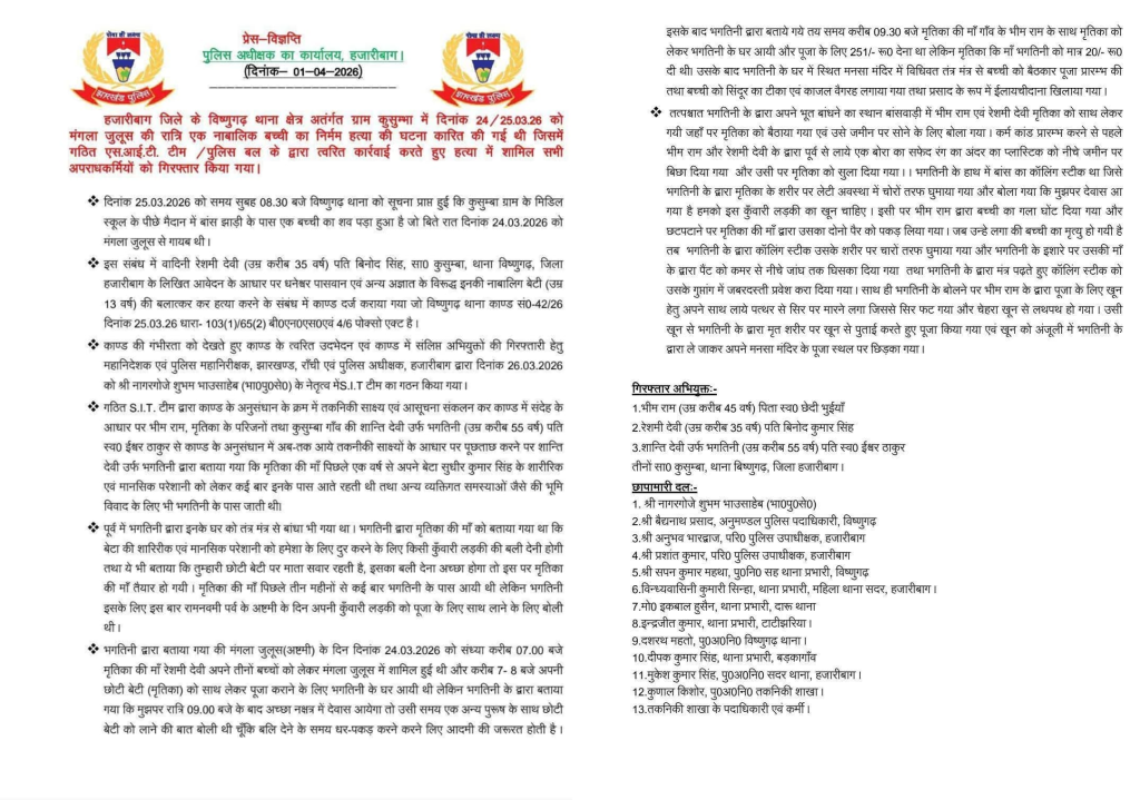हजारीबाग़ एसपी ने मामले का खुलासा करते हुए प्रेस रिलीज भी जारी किया है जिसमें अंकित है कि इस विभत्स हत्या को पुलिस ने गंभीरता से लेते हुए विशेष जांच टीम (SIT) का गठन किया। तकनीकी साक्ष्य और गहन अनुसंधान में सामने आया कि मृतका की मां रेशमी देवी लंबे समय से अपने बेटे की शारीरिक और मानसिक बिमारी के समाधान के लिए पास की एक महिला शांति देवी उर्फ भगतिन से संपर्क की। भगतिन ने समस्या के निपटान के लिए कुआंरी छोटी बेटी की बाले देनी की बात कही। अंधविश्वास में फंसकर कलयुगी मां रामनवमी के दिन सुनियोजित तरीके से बच्ची को पूजा के बहाने भगतिन के घर ले गई और तंत्र-मंत्र की आड़ में बच्ची की क्रूरता से हत्या कर दी। इस पुरे प्रकरण में बच्ची की मां के साथ एक अन्य आरोपी भीम राम जिसे बच्ची की मां का प्रेमी बताया जा रहा है उसकी भी संलिप्तता सामने आई है।